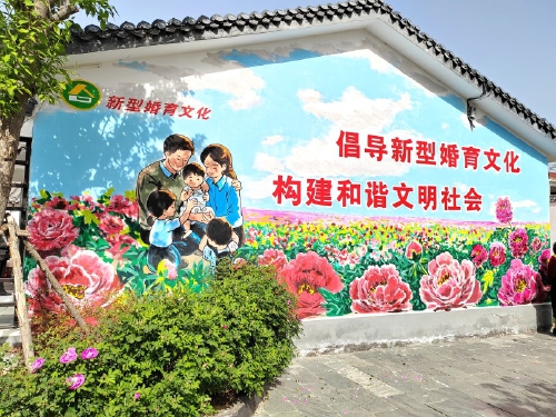 走进牡丹区牡丹街道李洪周村村民文化广场,一座“心心相印”主题雕塑和以牡丹为背景的美满家庭特色墙体绘画映入眼帘,它们象征着如牡丹般绚丽多彩、幸福美满的爱情,寓意着新生命的诞生为家庭带来无尽欢乐和幸福,也喻示着子孙绵延、生生不息。这里也是当地新型婚育文化的网红打卡点,众多恋人和夫妻在这里拍照留念,共同记录他们的爱情故事。在李洪周村的婚育文化图书角——记忆书房,书架上摆放了许多关于婚育文化的书籍,从爱情心理学、婚姻社会学、备孕指南到育儿百科、家庭教育方法,定期轮换更新。在这里,村计生协会经常组织开展交友活动,青年男女通过自我介绍、互动交流、分组游戏等环节,拉近彼此距离。在这里,经常有计生协会会员分享适龄婚育、优生优育、破除高价彩礼等事例,让参加活动的群众在潜移默化中受到新型婚育文化的浸润。在李洪周的乡村大舞台,村计生协会经常组织文艺演出,村民们将自己的身边人、身边事融入作品创作中,以寓教于乐的形式倡导婚育新风;牡丹花会期间,这里每天上午都会有精彩的文艺演出,吸引众多群众前来观看;在每年的5月和10月,这里都会举办全区相亲大会,成为单身青年搭建情感交流的平台。这里还有一个颇具特色的中医药婚育文化广场,经常组织开展中医婚育文化主题活动,实现了中医文化和新型婚育理念的巧妙融合。李洪周村温馨和谐的新型婚育文化氛围仅仅是菏泽市牡丹区新型婚育文化建设的一个缩影。