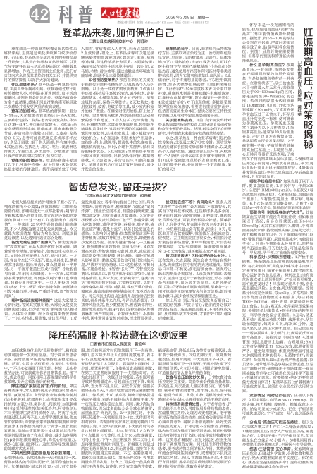 科学应对:从预防到管理。1.产检不能偷懒。妊娠期高血压管理的关键是规律产检:每次必测血压(高危孕妇建议家中自测),定期查尿蛋白(筛查子痫前期),配合超声和胎心监护评估胎儿状况。特别注意:当有高危因素或者上述预警信号,产检可能更频繁,再忙也要及时去!早发现才能早干预,别让疏忽酿成风险。2.饮食:吃对很重要。控制盐分但别完全戒盐(每天≤5g),多吃鸡蛋、瘦肉等高蛋白食物预防子痫前期,每日补钙1000-1500mg。避开腊肉、咸菜等隐形盐加工食品。注意:喝豆浆、吃芹菜降压效果有限,关键还是均衡饮食+医生指导的钙剂补充!科学饮食比偏方更靠谱。3.运动:动还是不动?适度运动很关键!选择散步、孕妇瑜伽或游泳,每周3-5次,每次30分钟。避免久坐久站,防止水肿和血栓。但记住原则——运动要温和,量力而行,过度运动反而可能升高血压。保持活动,但别逞强!4.体重管理:别让肥胖雪上加霜。合理增重:BMI正常者孕期增重11-16kg为宜,肥胖者需更严格。避免短期猛涨:体重突然增加可能是水肿或隐性水肿的信号。5.药物治疗:听医生的!妊娠期高血压用药需严格遵医嘱:拉贝洛尔、硝苯地平等是孕期安全降压药,切忌自行调整剂量;硫酸镁用于预防重度子痫前期抽搐;高危孕妇可能需在医生指导下服用小剂量阿司匹林。重要提醒:绝对不要尝试偏方或擅自停药!某些降压药(如"普利类")可能危害胎儿,必须由专业医生评估用药方案。